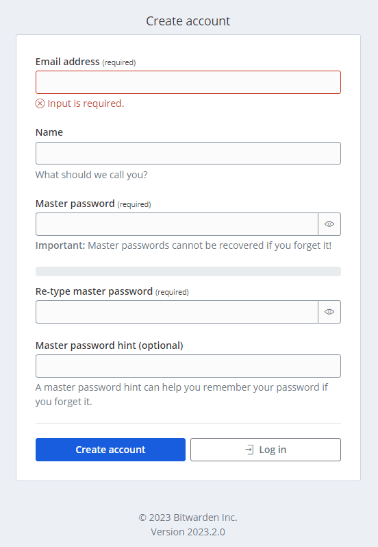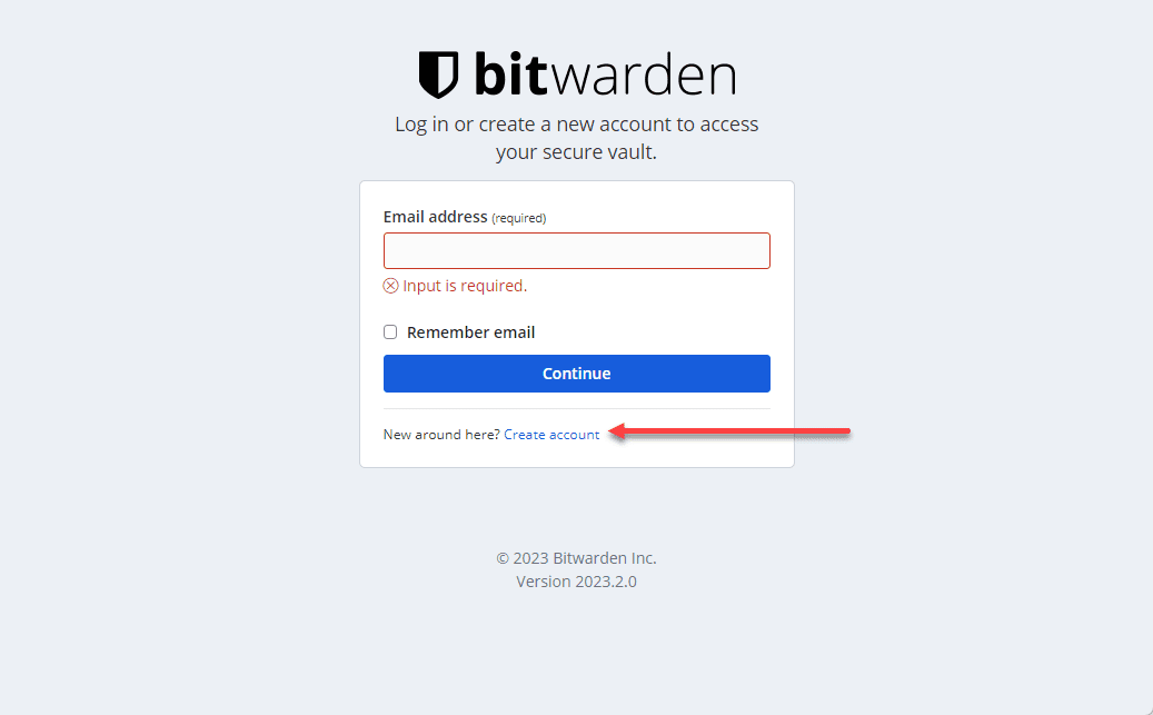Once you bring up the Bitwarden server, you will be presented with the login screen. Don’t get confused here as you won’t be entering the email address you signed up for on the host page when you receive the ID and Key. You will need to click the Create account link.