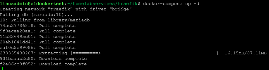 The containers start pulling down with the Docker Compose up -d command.