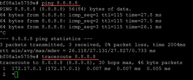 This command shows the path packets take from your container to the Google DNS server. You see other details like latency, etc.