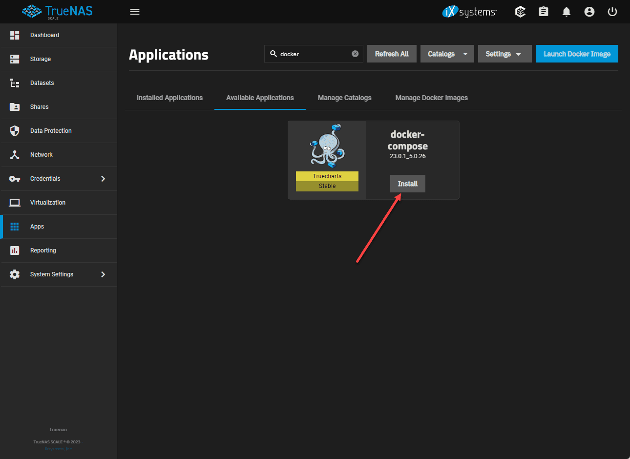 You will still need to install the Docker Compose app via Truecharts as shown, or in an unsupported way by manually installing Docker Compose at the OS level which will not be integrated with your TrueNAS SCALE dashboard and apps.