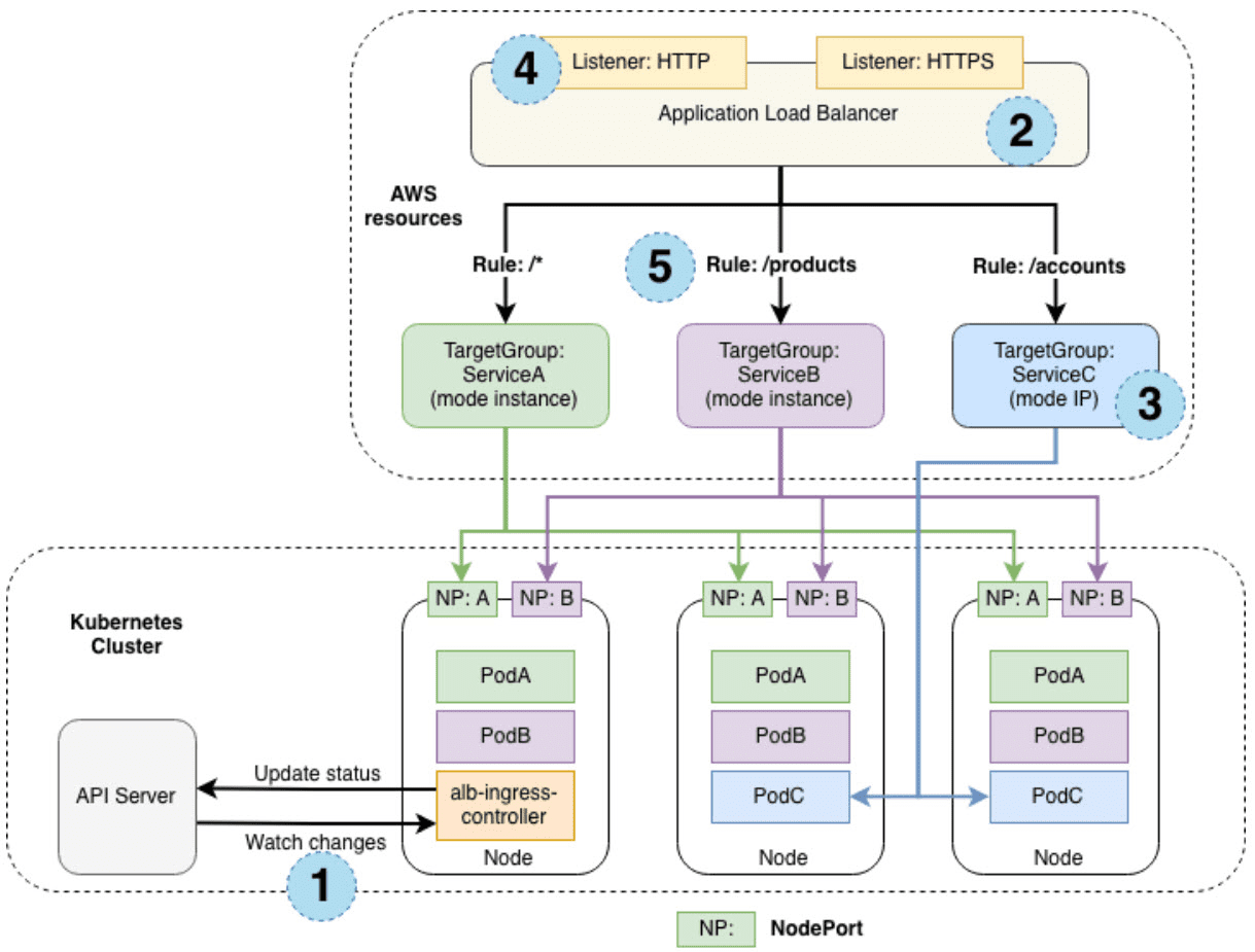 The AWS Load Balancer Controller manages AWS Elastic Load Balancers for a Kubernetes cluster, provisioning the following resources: