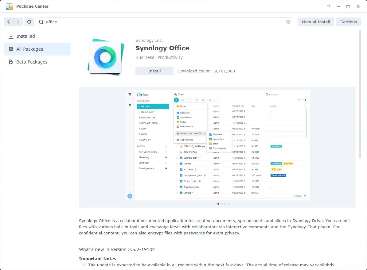 Synology also provides a productivity suite in the form of Synology Office. With it, you can create, edit, and share documents and also spreadsheets along with presentations, etc. It has real-time collaboration features built-in too and allows multiple users at the same time to work on docs.