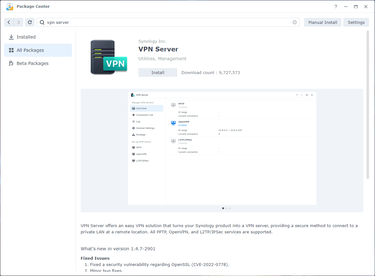 There are many third-party VPNs you can use, but Synology actually has one that is built into their app store. It is the Synology VPN server. It allows configuring and creating a VPN on your Synology NAS that allows you to remote in and access your resources just as if you were on your LAN.