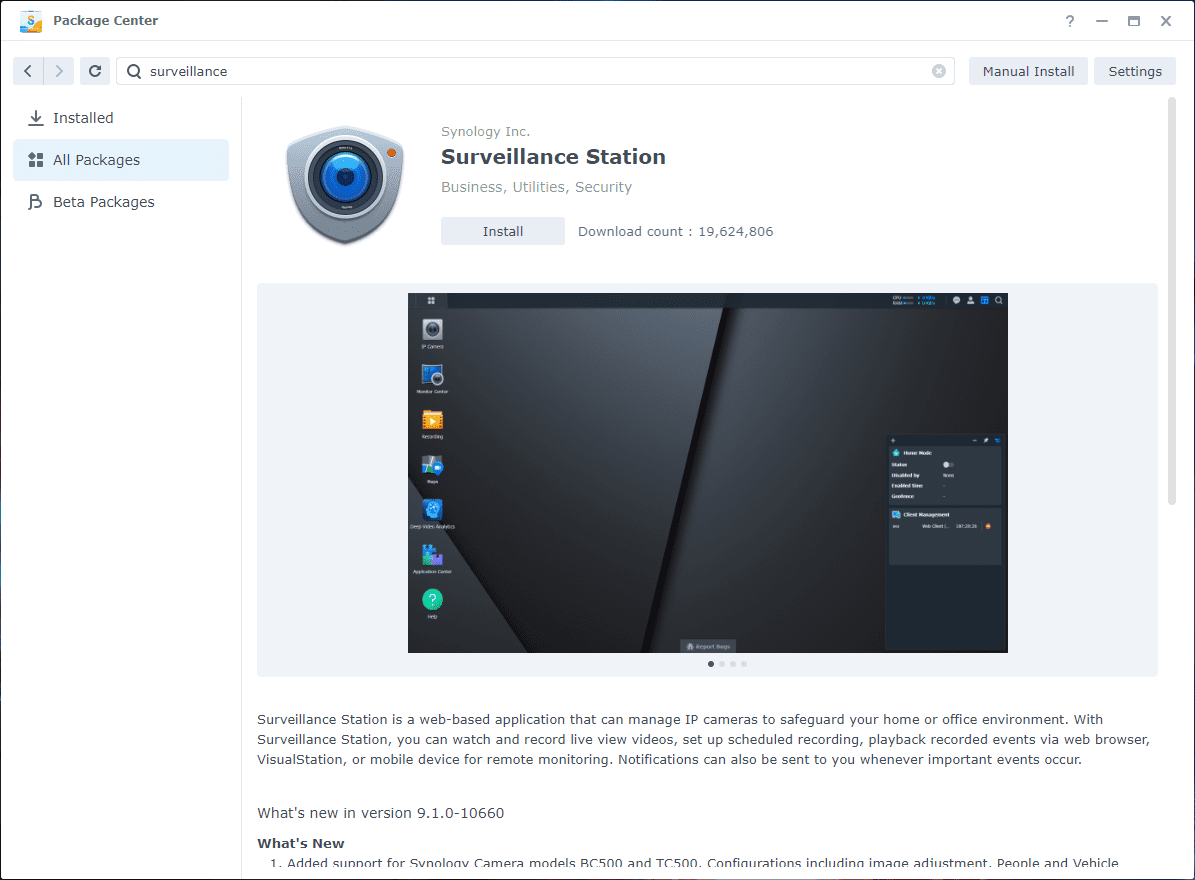 The Surveillance Station app is a surveillance solution that allows running a video monitoring system with IP cameras connected to your Synology NAS device. It has many good features for an IP camera system, including real-time video monitoring, motion detection, and you can setup event notifications such as if a camera “sees” motion.