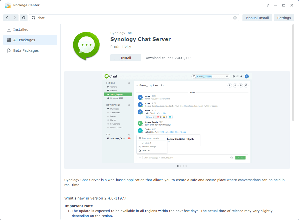 Synology Chat is a server app you can stand up to enable a fully featured messaging platform directly from your Synology NAS device. Using the app, you can communicate with text, voic, or video. It also allows sharing resources like docs, images, and other file resources with other team members and users.
