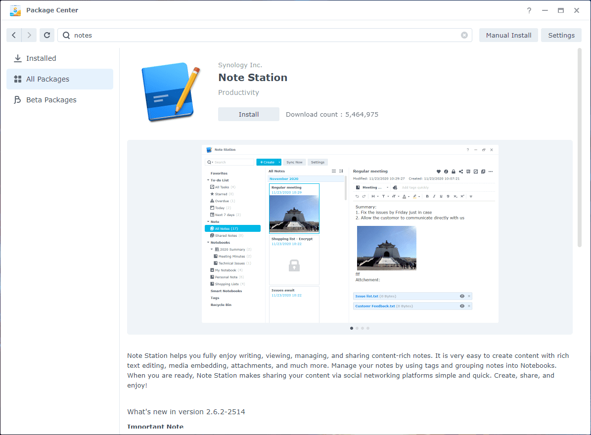 Synology notes is a note taking app where you can create, edit, and share your notes in your NAS environment. It has a text editor with many features and you can attach multimedia to notes (pictures, video, etc). You can also collaborate on notes with others.