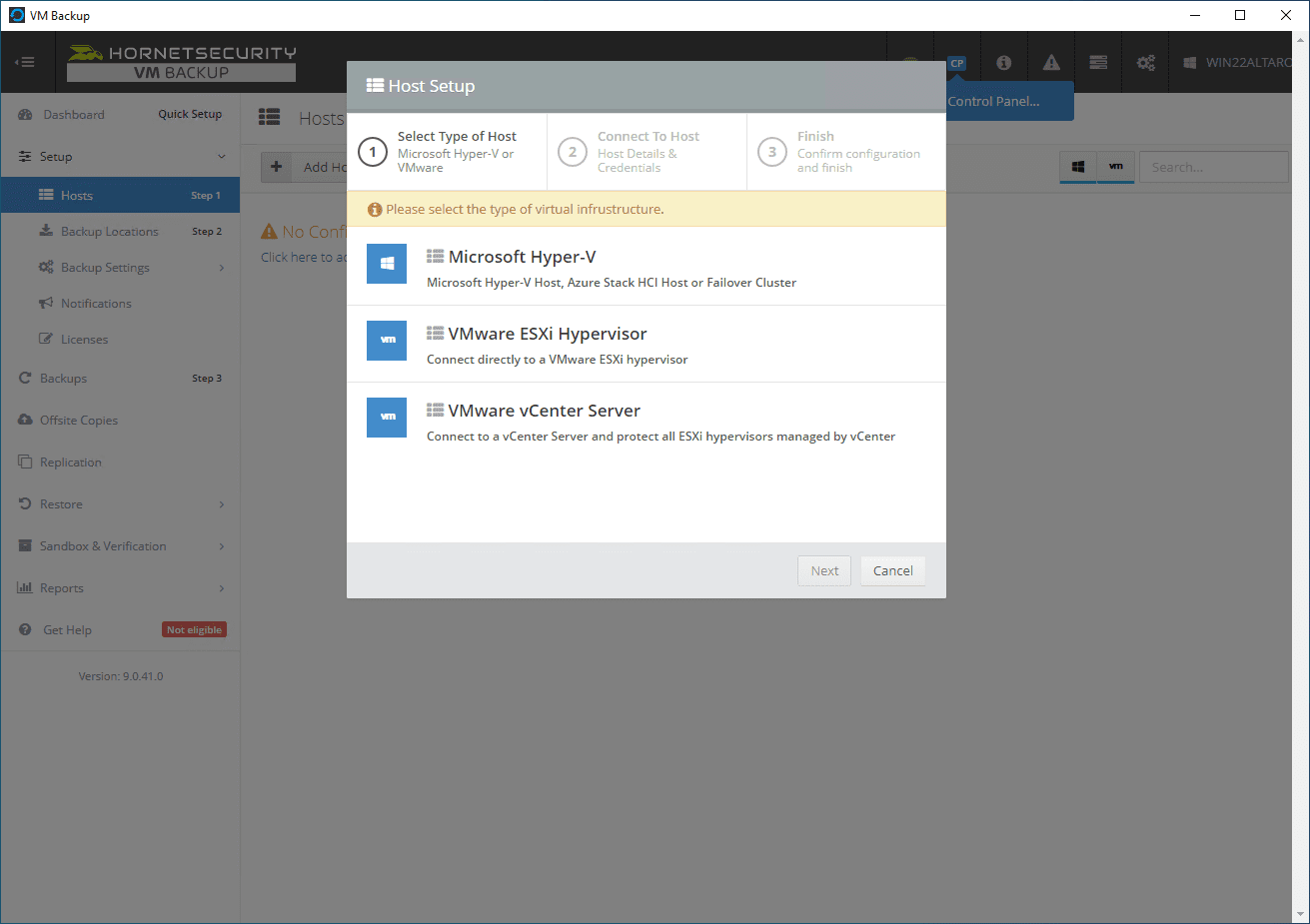 Next, select the host setup. You can choose from Hyper-V or VMware.