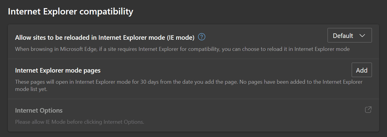 Under “Internet Explorer compatibility“, turn on the “Allow sites to be reloaded in Internet Explorer mode” option.