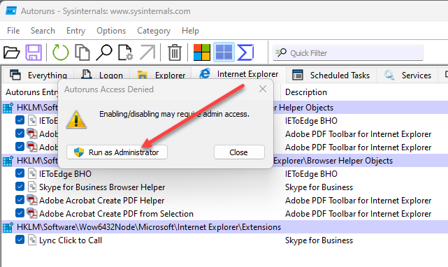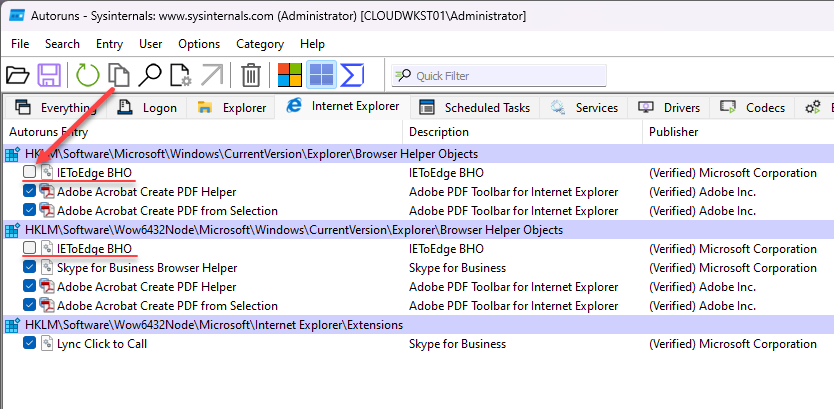 One of the best ways to disable the redirection is to disable the browser helper object since no matter if the BHO folder is put back in place, it will be disabled. While you can manually edit the registry, an easy way is to download the Autoruns program from SysInternals. With Autoruns, you can disable it by simply unchecking the box next to the Browser helper object under the Internet Explorer category which disables the registry key.