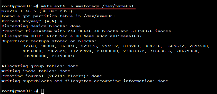mkfs.ext4 -L vmstorage /dev/nvmeOn1