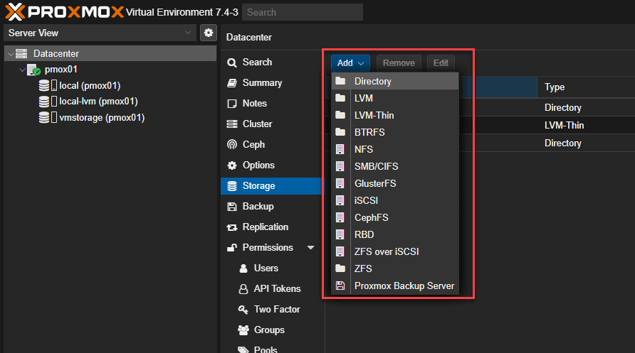 3. Click on the “Add” button. Then you will want to “Directory” from the dropdown menu. There will be a few options including lvm thin, think provisioning, volume group and others.
