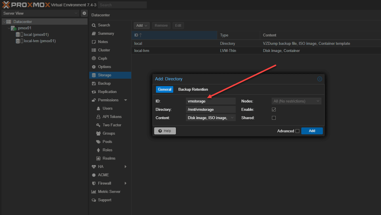 Now that the new partition is mounted, you can add it as storage space in the Proxmox web interface.