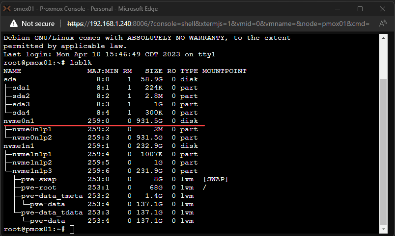 Next, we can use the lsblk command to pinpoint the new NVMe drive we want to add to our Proxmox installation. For example, the drive may appear as dev/nvme0n1. You will see the normal disks such as dev sda dev sda1.