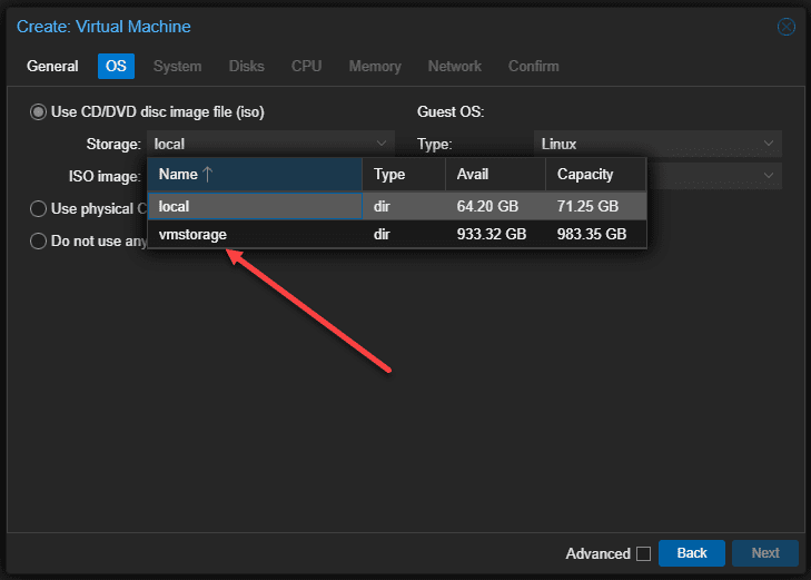 Now, when you create a new virtual machine or container you will see the storage available to select in the storage drop down.