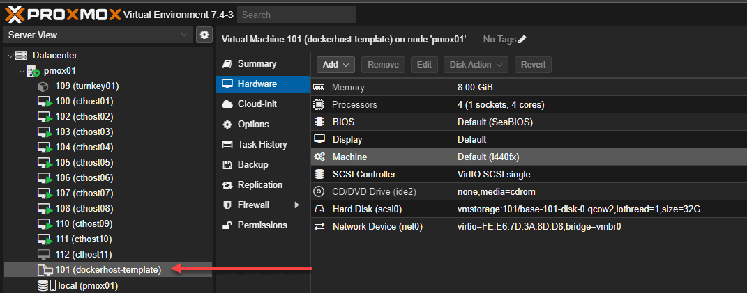 Below, I have created an Ubuntu Server 22.04 virtual machine template for cloning additional VMs for container hosts.