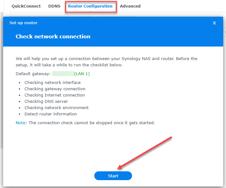Synology DSM has a means under Control panel to help configure the connection between your Synology NAS and your router. Navigate to Router Configuration.