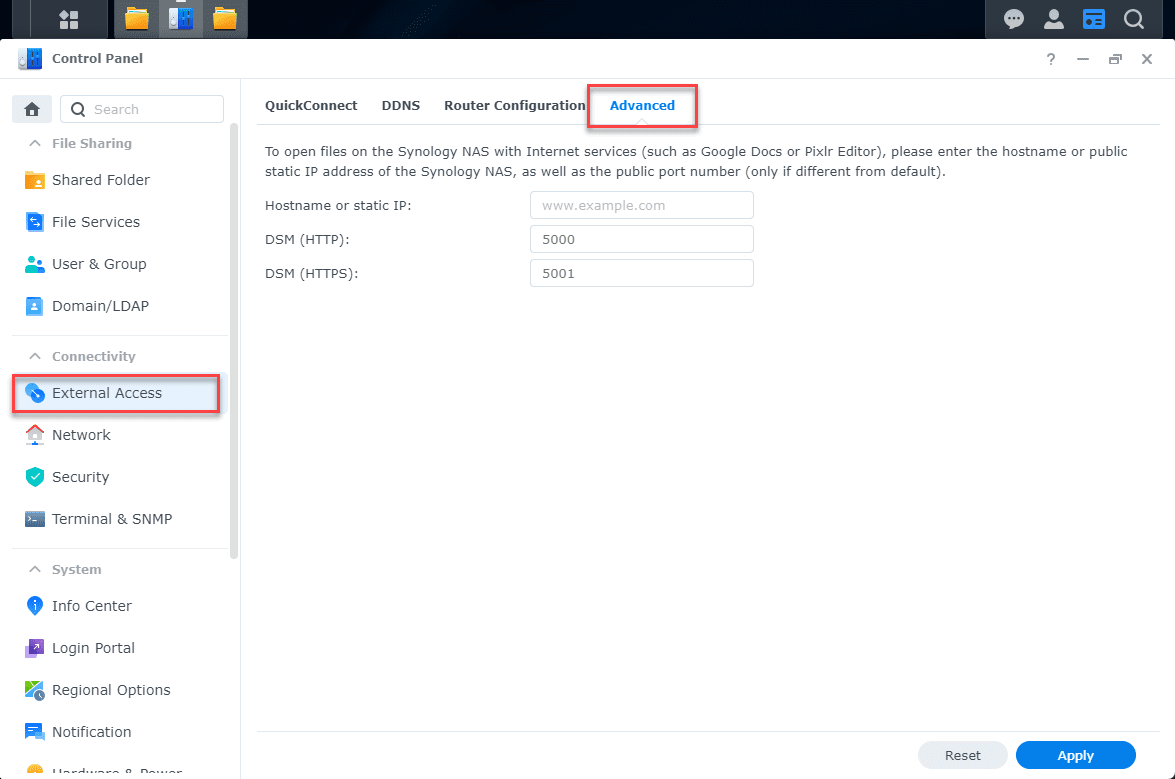 Under the Advanced settings, you can set up a hostname or static IP. This will enable you to open files on the Synology NAS with Internet services like Google Docs or Pixlr Editor.