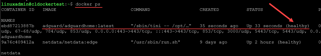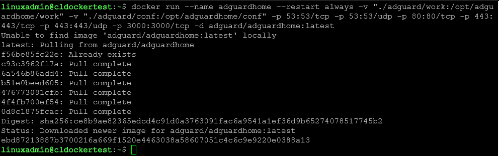 After hitting ENTER, the container image will pull and spin up the new Adguard DNS container.