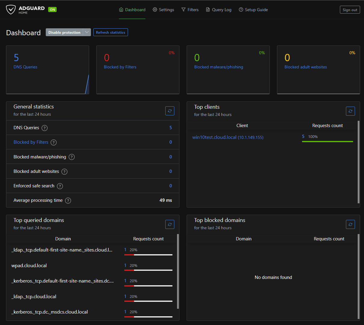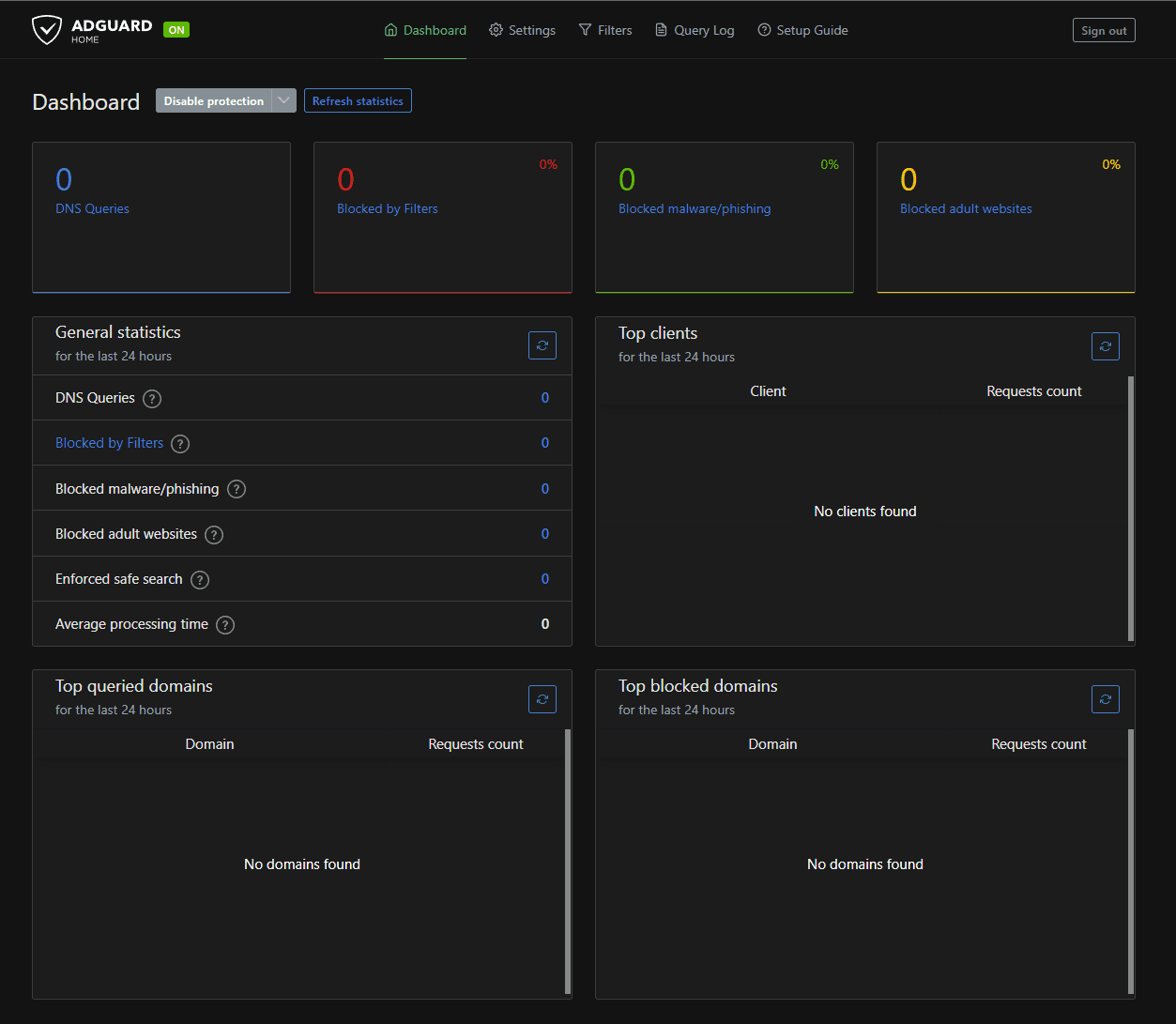 You will see your Adguard dashboard displayed. As you can see there are no queries currently. We will need to configure clients to use the custom DNS settings.