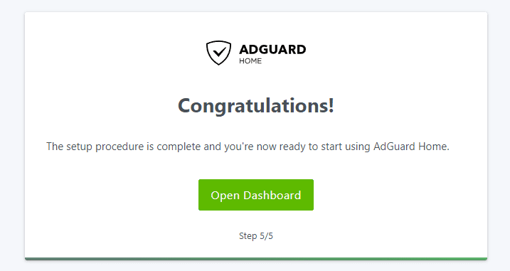 The wizard is finished. Open the Adguard dashboard.