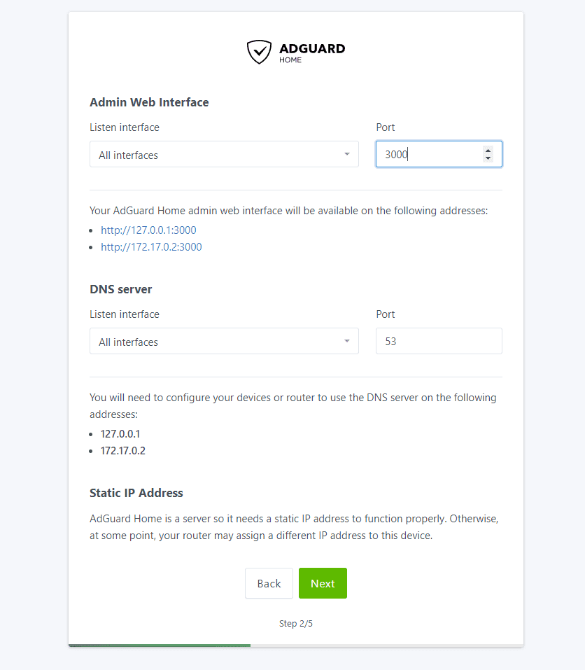 Once you have pulled the docker container, you can browse to the HTTP://<your Adguard IP or FQDN>:3000 and it will launch the initial configuration wizard.
