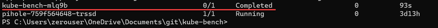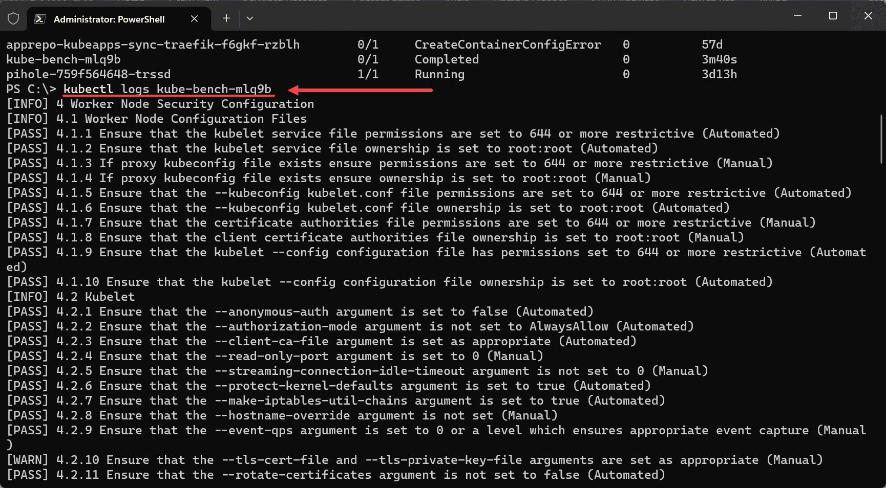After the security scan runs, you will look at the logs for the pod, using general command kubectl logs <kube-bench pod name>