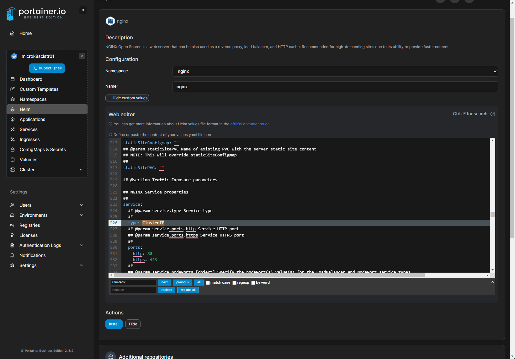 One of the really cool things about Portainer is it allows you to install an ingress controller like Traefik easily. Below, I have added the Traefik Helm repo and am ready to install the chart using Portainer.