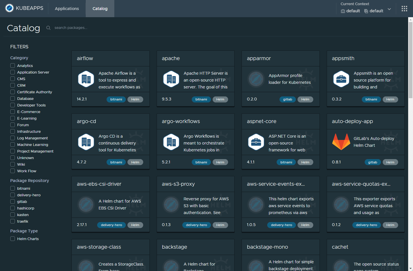 You can also use apps in themselves that are great tools for Kubernetes, like Kubeapps. Below is a shot of Kubeapps, an application in itself that runs in Kubernetes and allows you to easily install other applications in your environment.