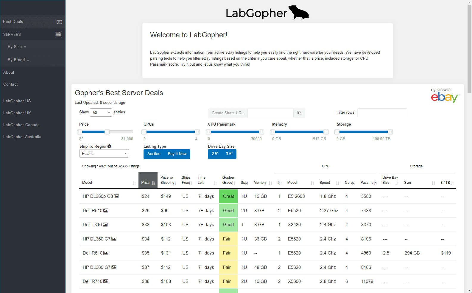 Starting a home lab server setup begins with getting your hands on the right hardware. Servers come in many different configs, etc. These will offer different levels of performance, power consumption, and cost. Lab Gopher is a website for finding used server hardware deals and allows you to filter server listings, from eBay.