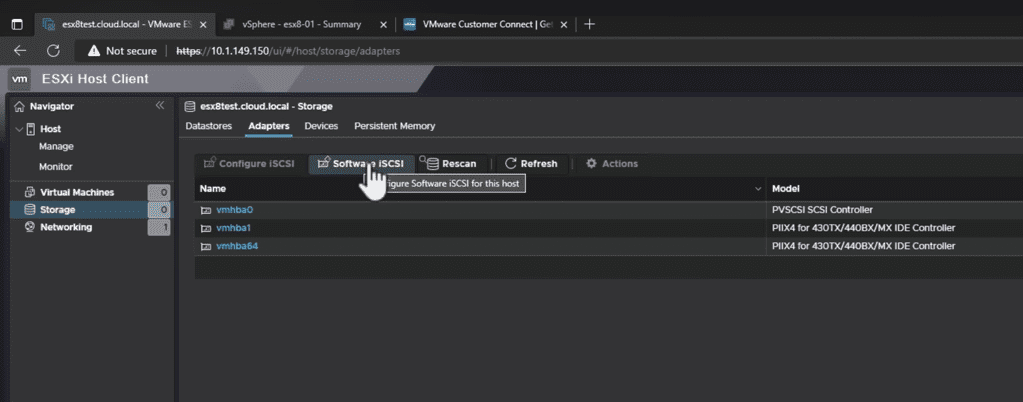 - Adding the Software iSCSI Adapter: This can be done under Storage > Storage Adapters > Add software iSCSI adapter in the ESXi host client.