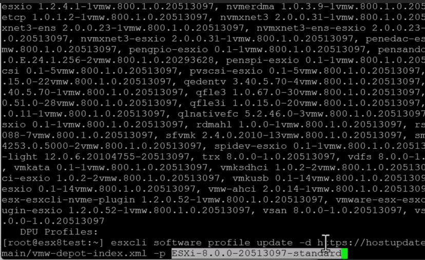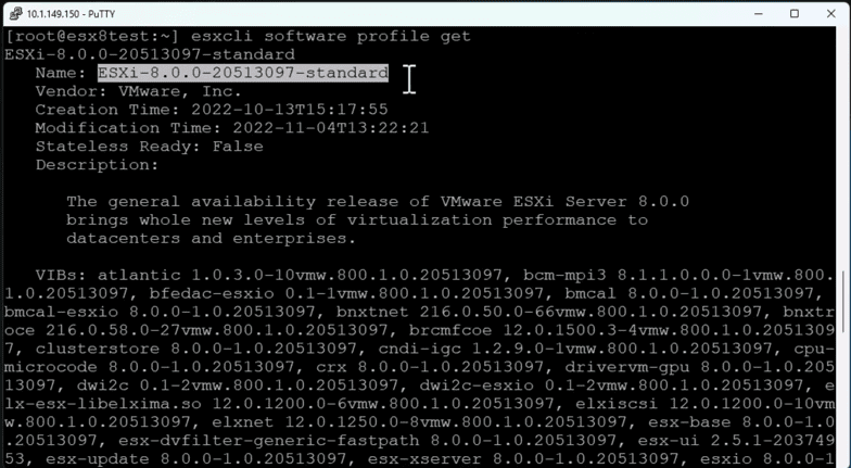 - Getting the Software Profile: This can be retrieved using the “esxcli software profile get” command in SSH.