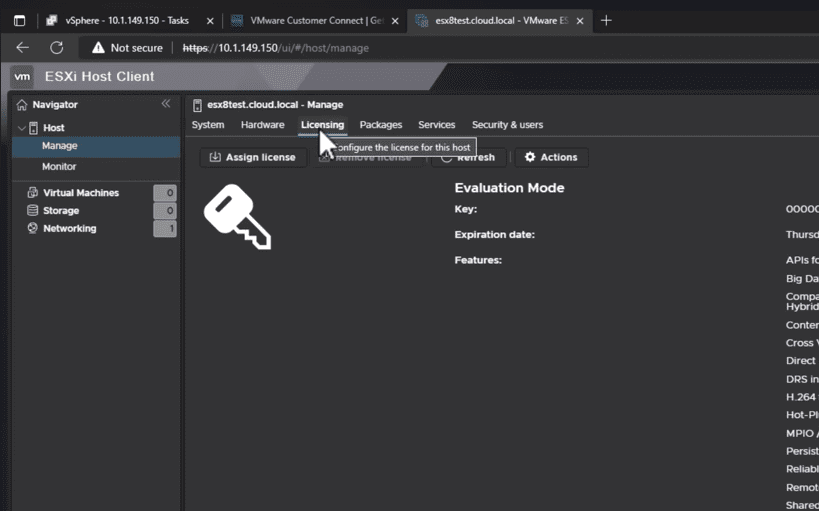 - Adding the License in the Host Client: This can be done in the ESXi host client under Manage > Licensing > Assign license.