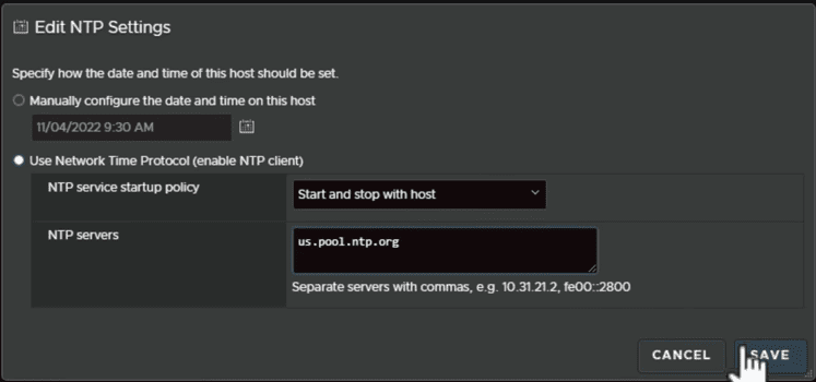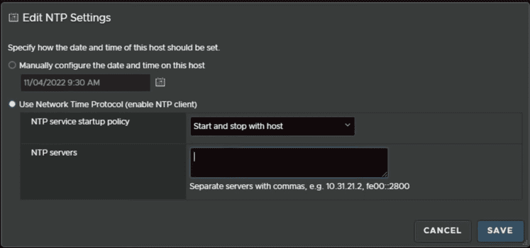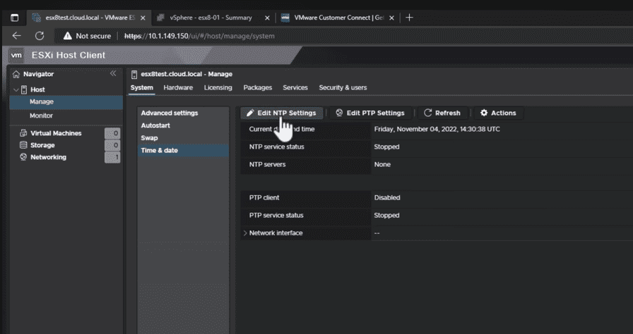 - Setting the NTP Server Configuration in VMware ESXi: This can be done in the ESXi host client under Host > Manage > Time & date > Edit NTP settings.
