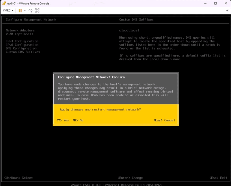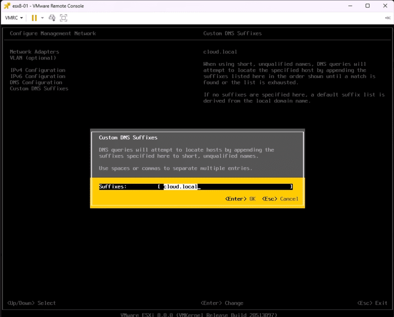 - Implementing DNS Suffixes for DNS Search Suffixes: You can set these in the same menu by navigating to Configure Management Network > DNS Configuration > DNS Suffixes.