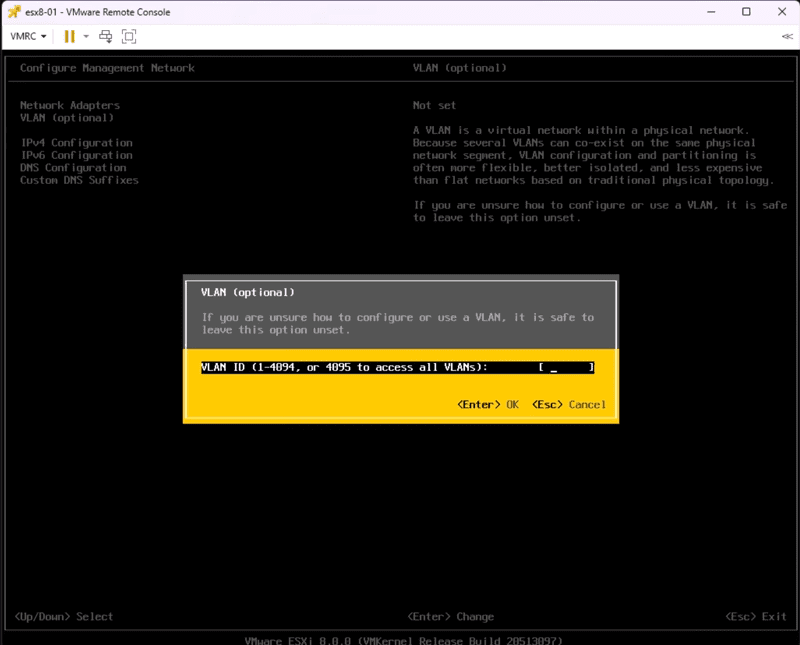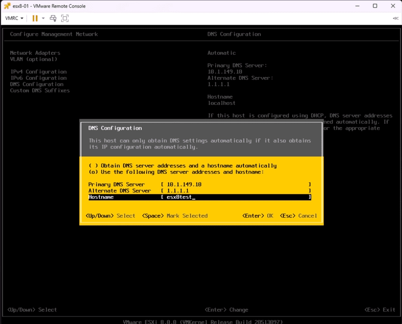 - Setting the Hostname: This is the unique name for your ESXi server and can be configured under Configure Management Network > DNS Configuration > Hostname.