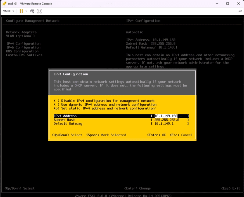 Below, we have chosen to configure the management network in the DCUI. You have several choices here: