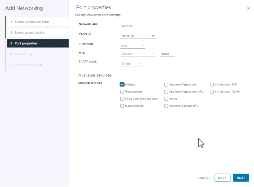 - Configuring the Port Properties: In the Add VMkernel NIC dialog box, configure the properties as per your requirements.