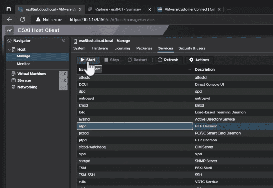 - Starting the NTP Service: Start the NTP service under Manage > Services > ntpd in the ESXi host client.
