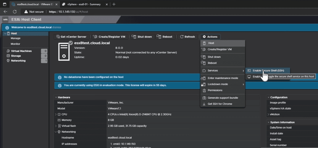- Enabling SSH on Your ESXi Host: This can be done from the ESXi host client under Host > Actions > Services > Enable Secure Shell (SSH).