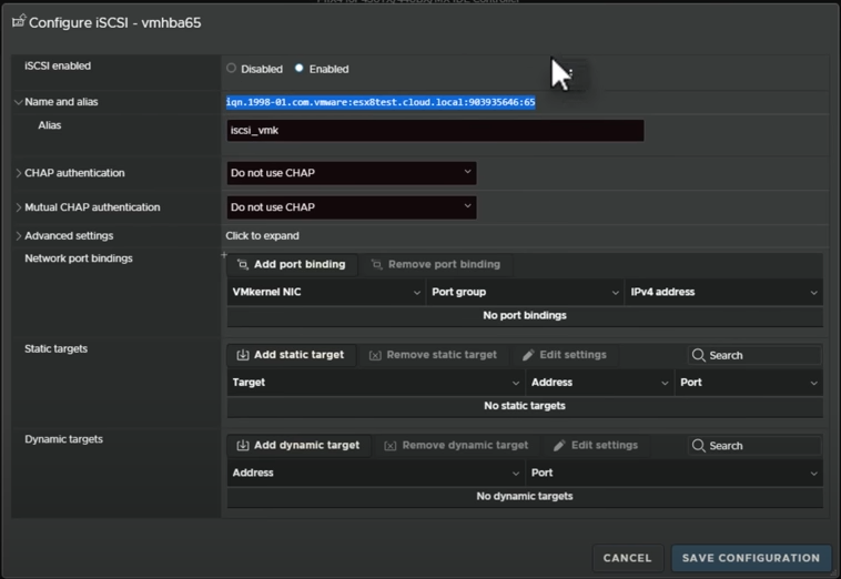 After you add the iSCSI Software adapter, you will see the IQN that is generated for the iSCSI initiator.