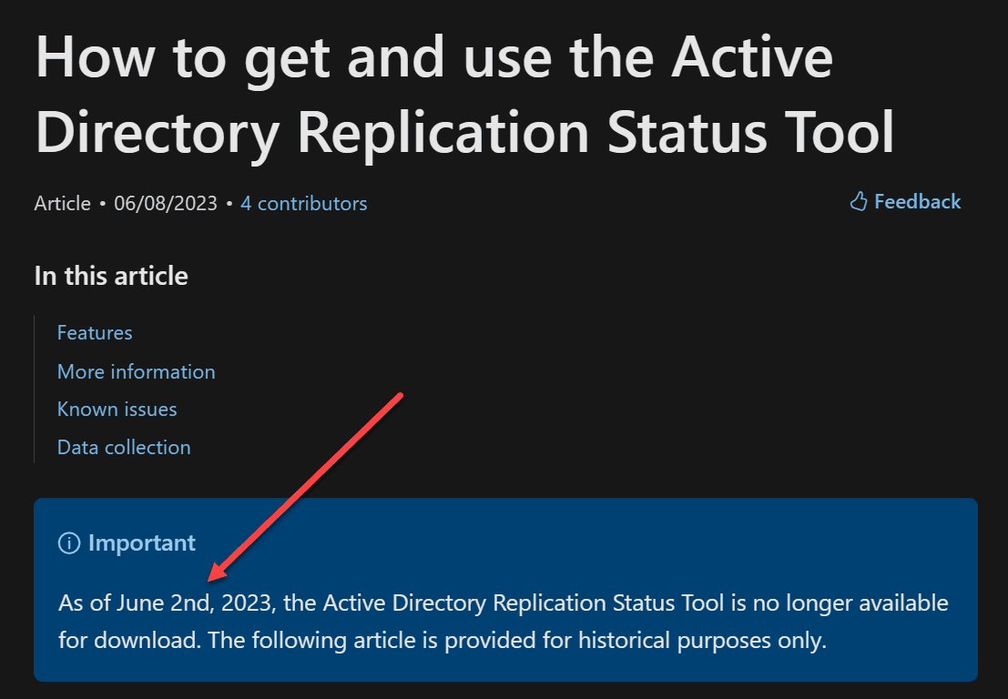 I am excited that we have a replacement tool for the AD Replication Status Tool since the official tool from Microsoft is now deprecated as of June 2, 2023. The new open-source tool is in its early stages of development. So with that in mind, new features will most likely be added moving forward. There are a few shortcomings to note: