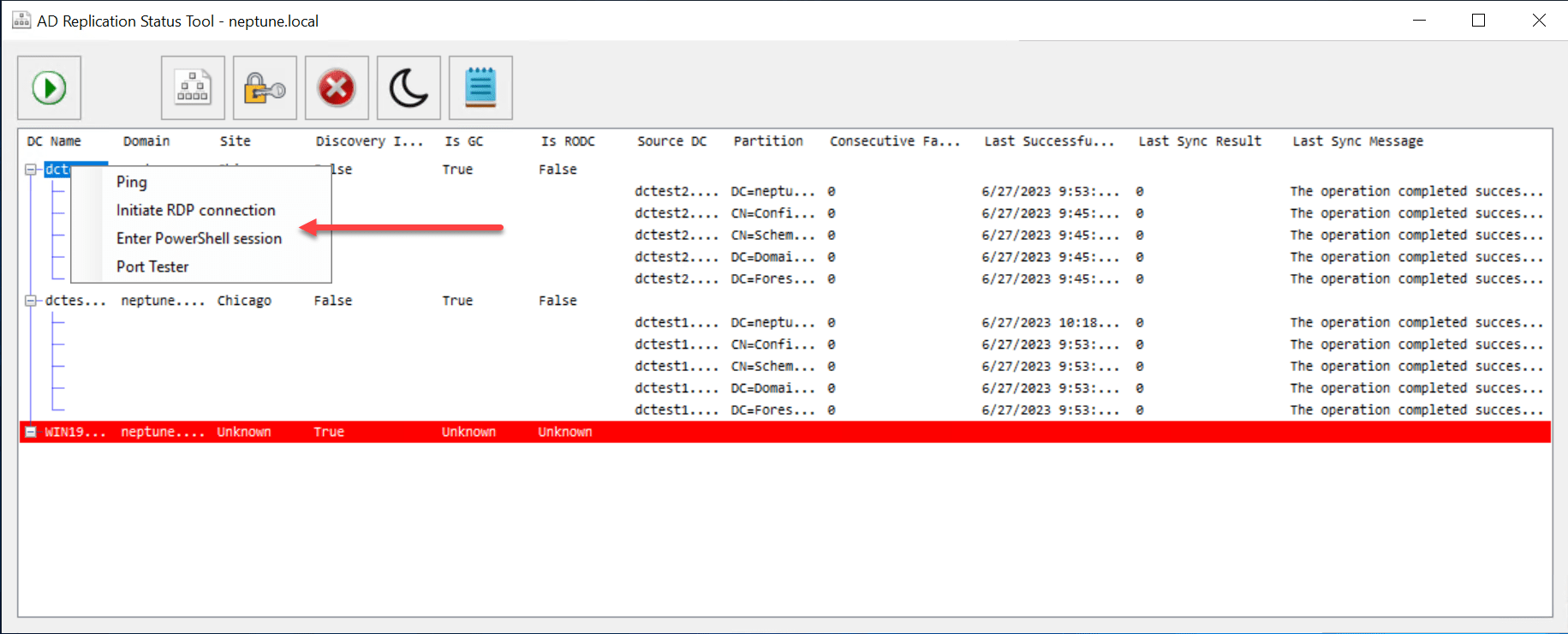 One of the neat things about the tool is you can right-click on any of the DCs, and you will get the context menu below for easy access to helpful tools: