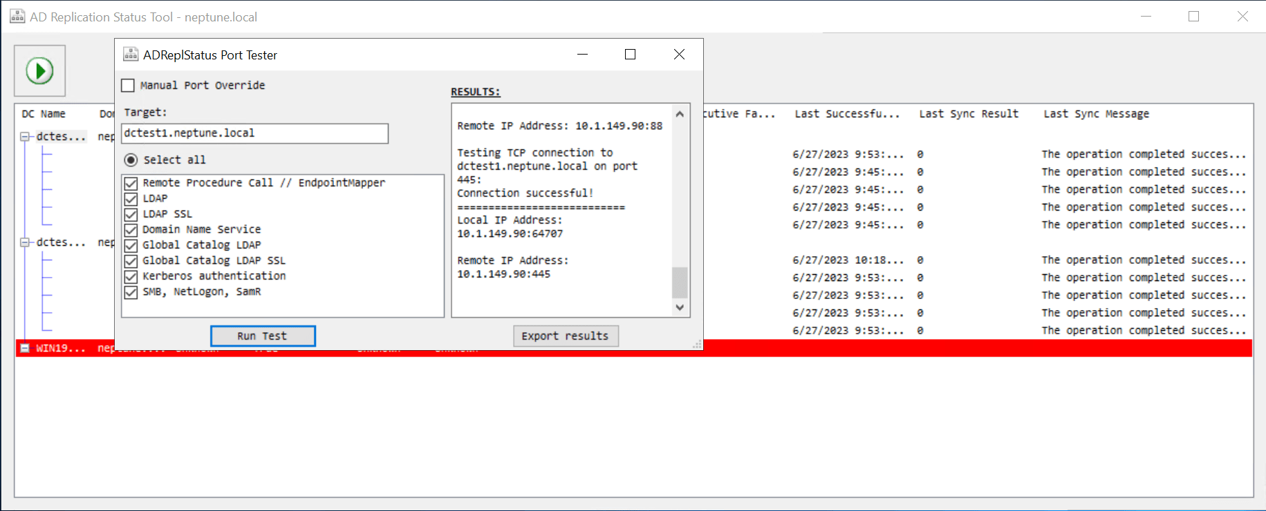 The Port Tester is a really cool part of the tool that allows you to check all of the relevant Active Directory service ports quickly.