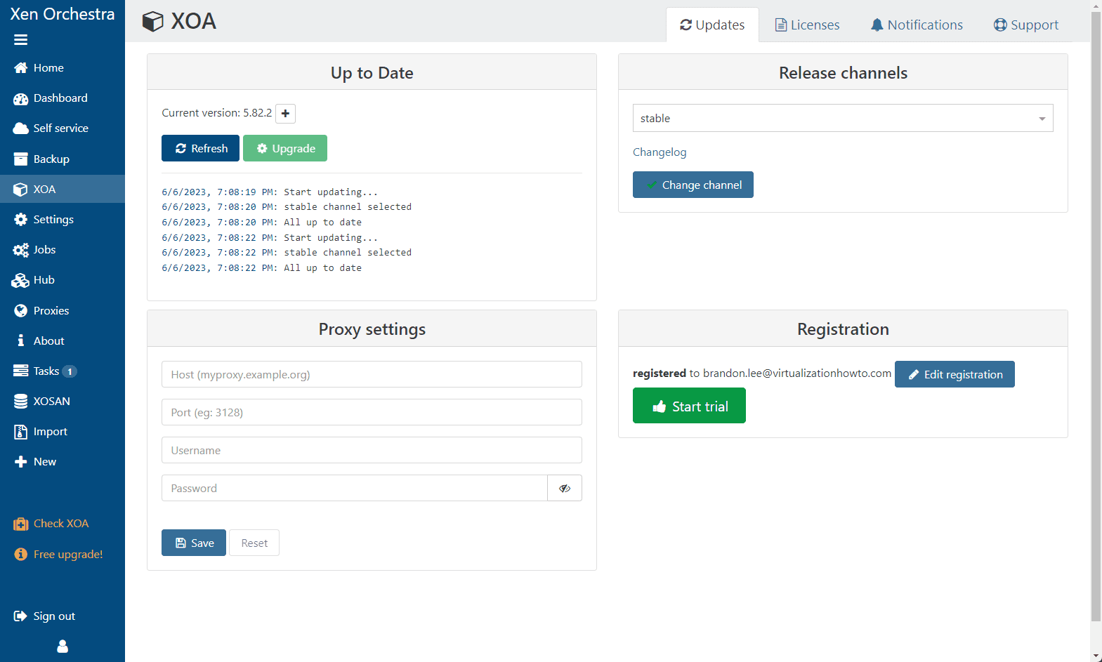Below is a shot of running XCP-ng and managing it with Xen Orchestra (free download), a great tool that provides many capabilities. You will need to register with an email address to update your Xen Orchestra installation.