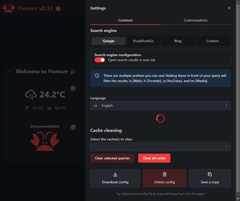 After switching to dark mode, viewing the Settings screen looks like the following. You can choose which search engine Homarr uses to search the web. You can also clear cache, etc.