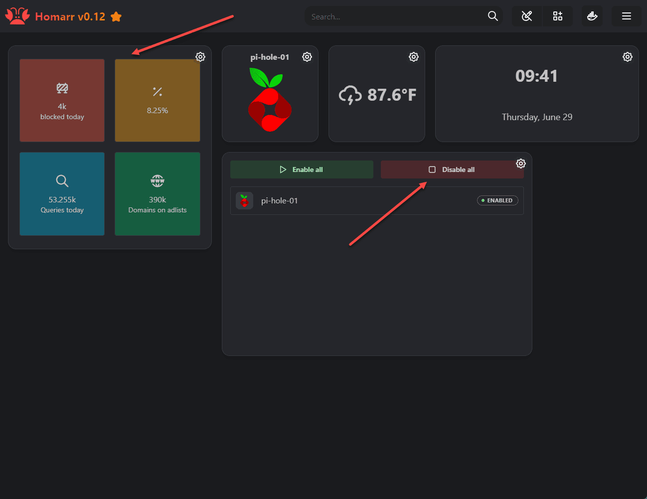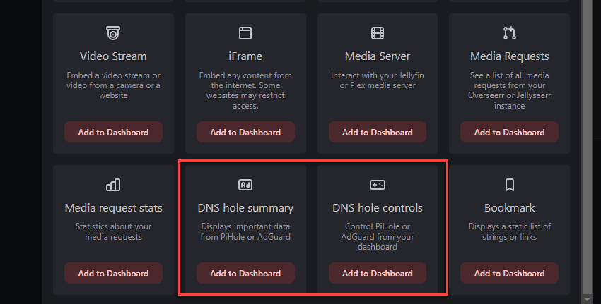 You can add deeper integration with Pi-Hole, Adguard Home, and others, by adding the DNS hole summary and DNS hole controls. The summary displays in real-time the blocks and other metrics from your DNS blocking solution. The controls allow you to disable the solution right from your Homarr dashboard.