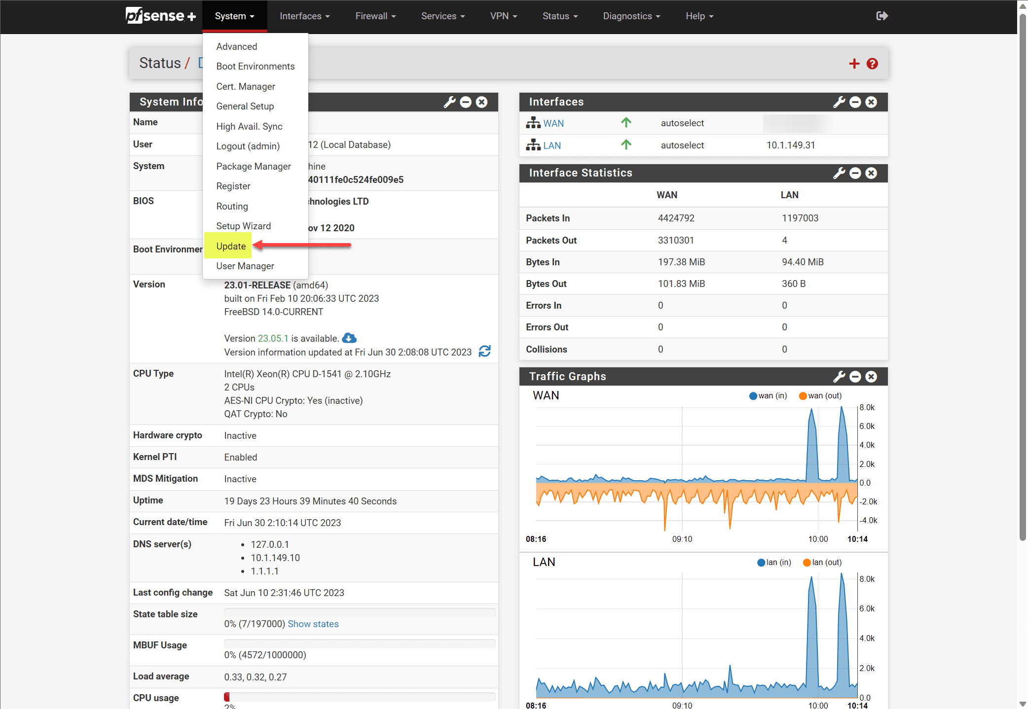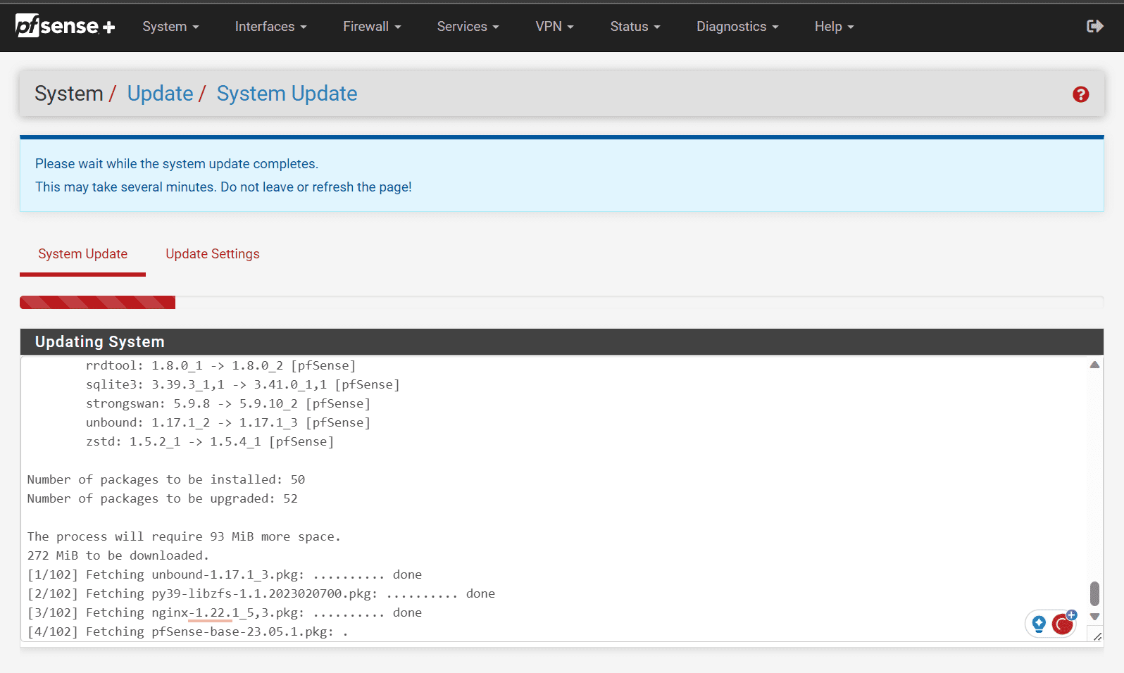 The screens below are from pfSense Plus, upgrading to the 23.05.1 release, but the steps are the same: