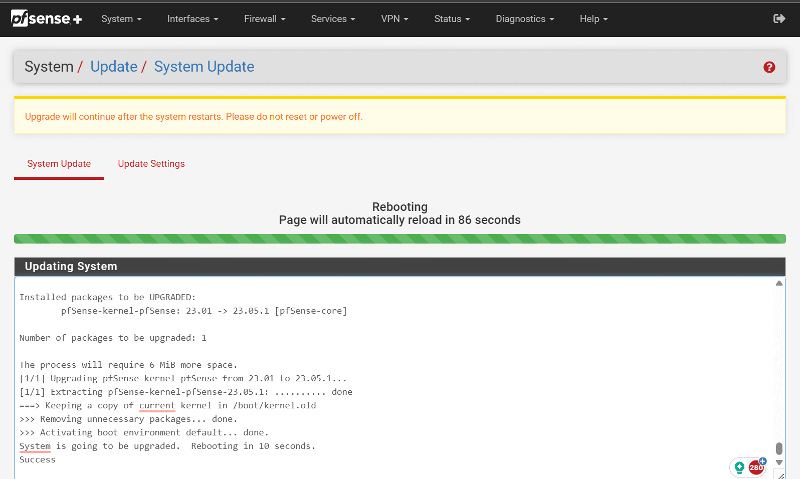 After a couple of minutes, the upgrade finishes and the system will count down until it reboots.