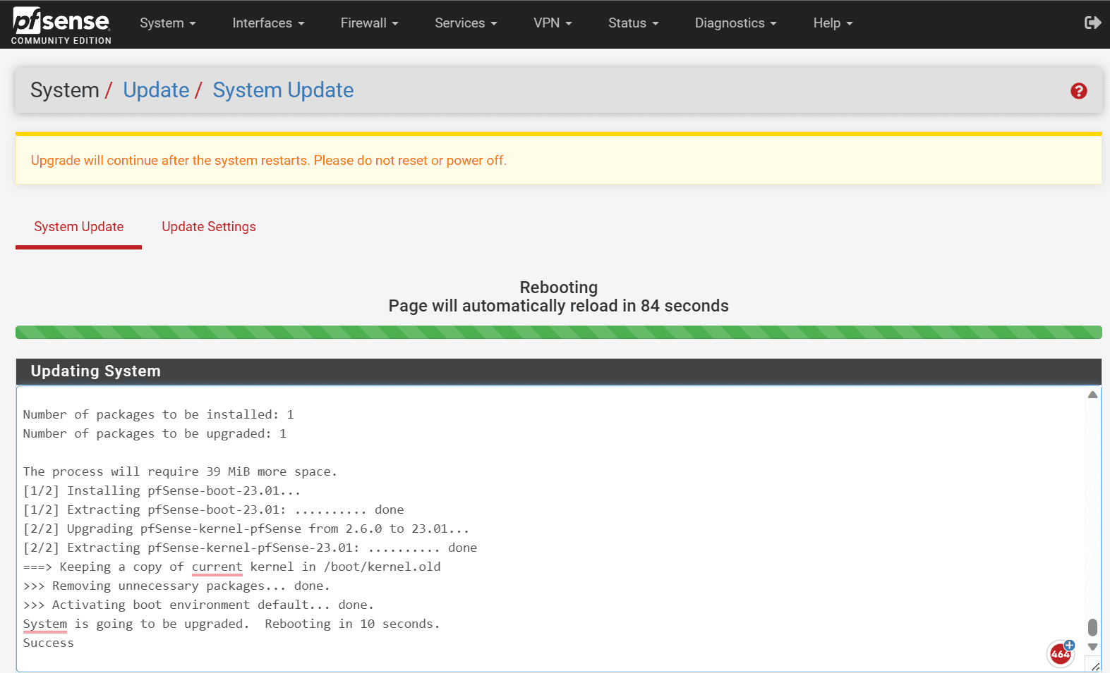 The System upgrade to pfSense Plus begins.
