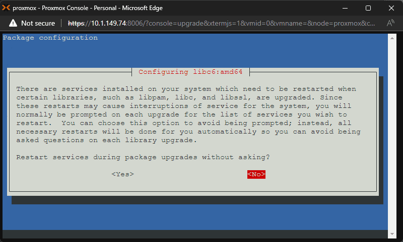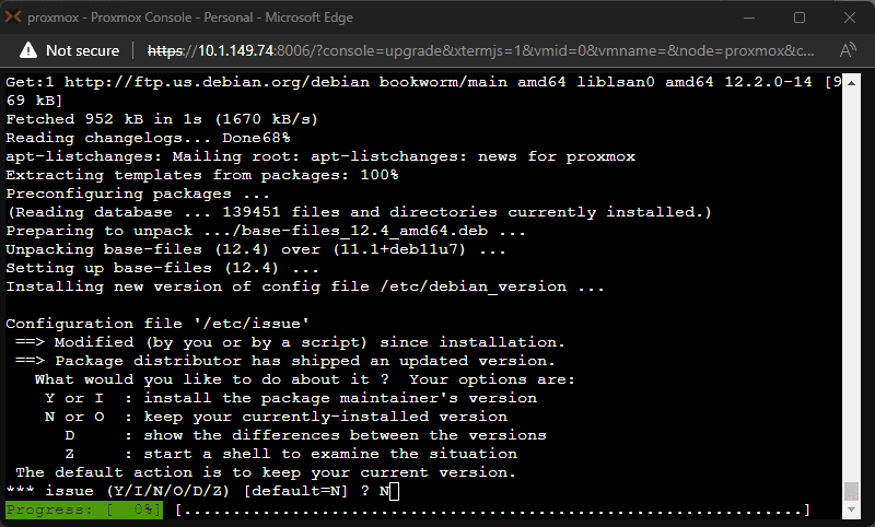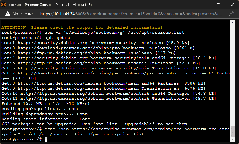 Now, we begin the steps to start the upgrade to Proxmox 8. Update all Debian and Proxmox VE repository entries to Bookworm with the following command:
